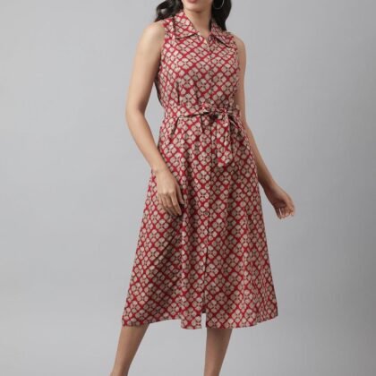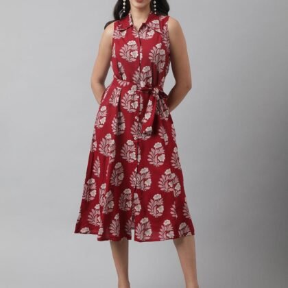 Rayon Maroon & Pink A-Line Floral Printed Midi Dress