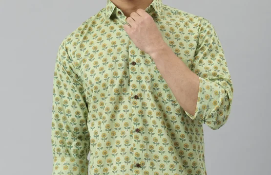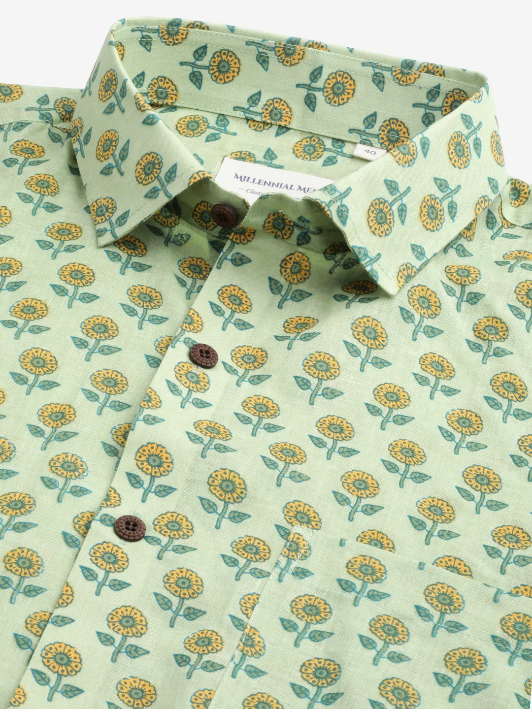 Light Green & Yellow printed casual shirt, has a spread collar, Full sleeves, button placket, curved hem, and 1 patch pocket