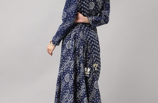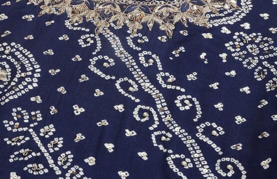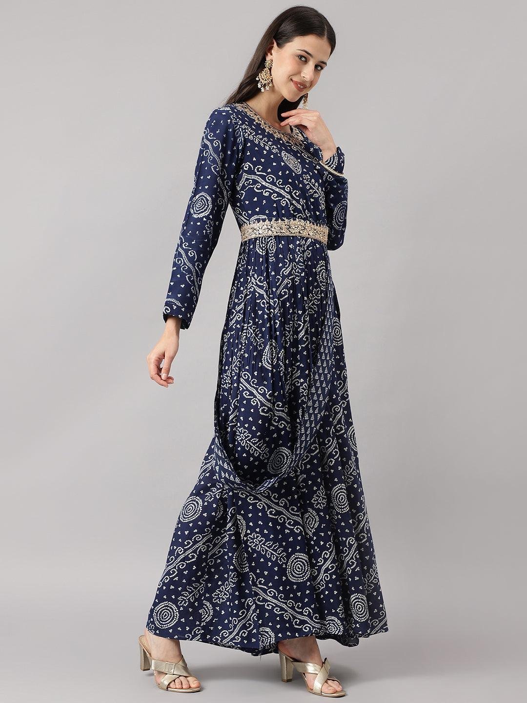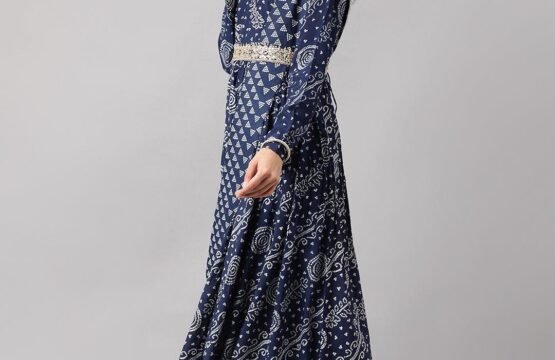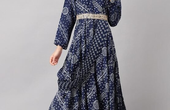 Keeping In Mind Need of Today’s World for Perfect Style, Elegance and Comfort. Fashion Baazar Navy Blue bandhani Printed Muslin Zari work Drape Style Flared Gown Gathering pattern Flared floor length Gown. it has round neck coved with Embroidery zari work and Golden embroidery Sequined work in gown with attached a dupatta in drape style to give ethnic look. For The Feminine Look and You Are Ready to Be in The Lime Light Of Every Party.