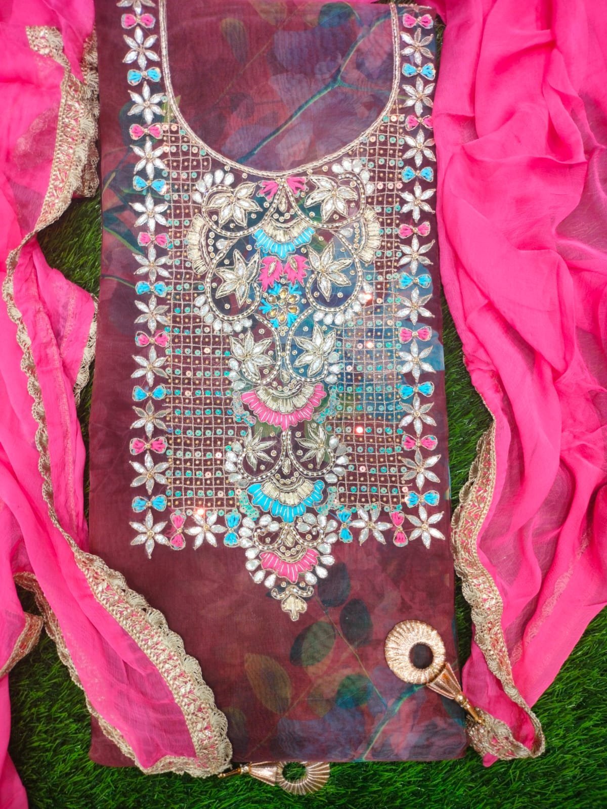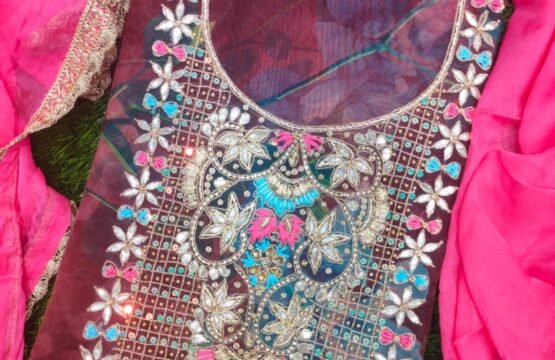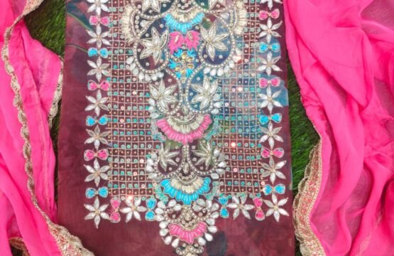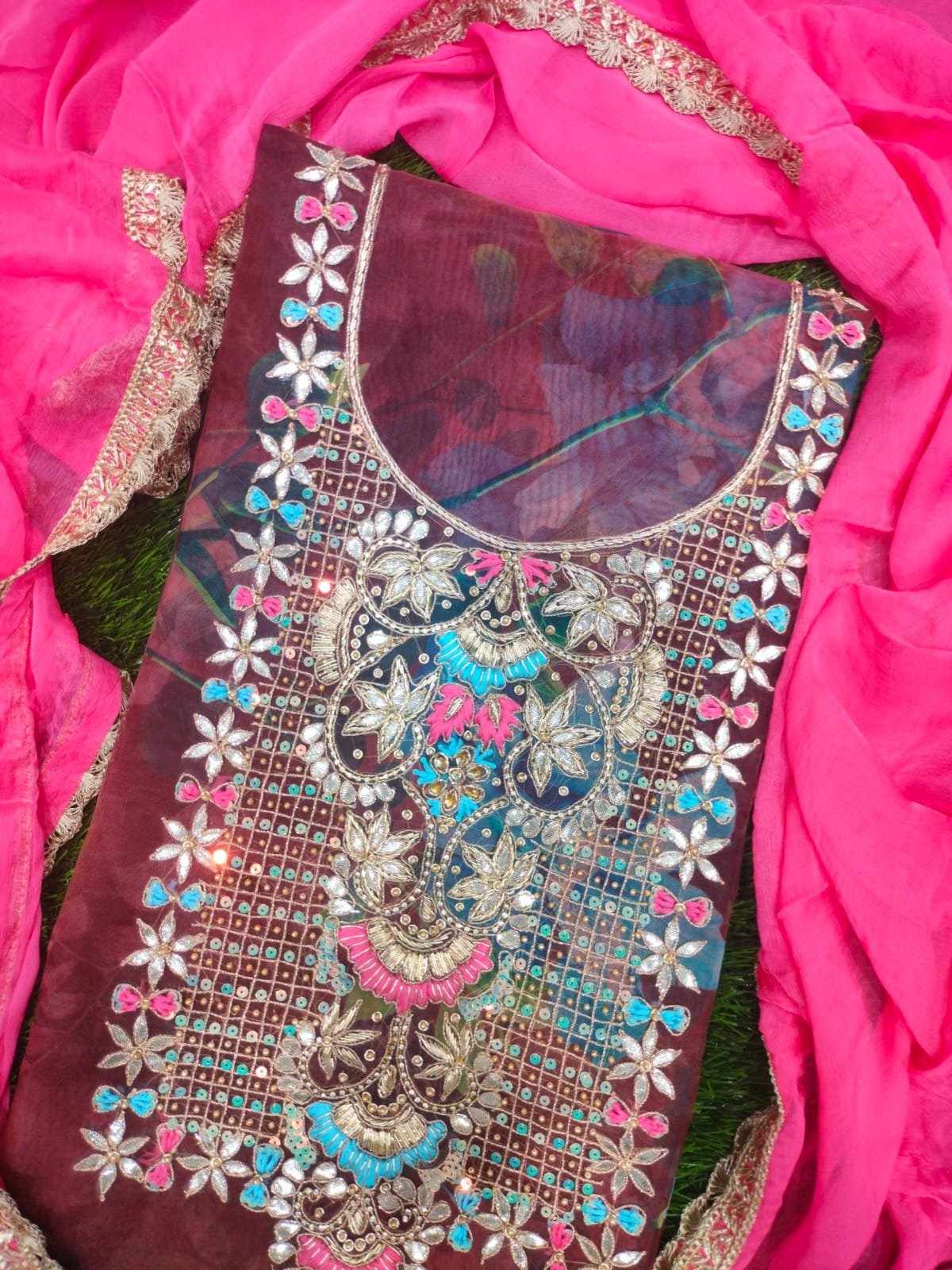 Multi-colored unstitched organza fabric suit paired with dark pink color Salwar and dupatta.