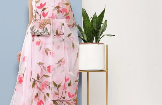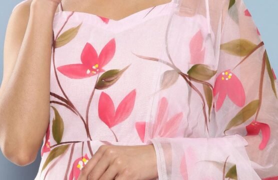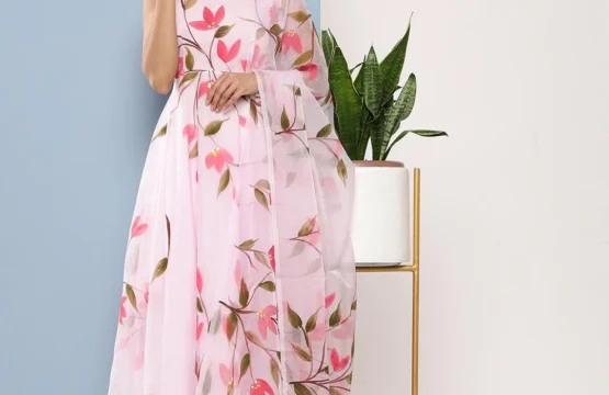 Swirl around in Your Best Moves with Divena Light Pink Hand Painted Floral Organza Anarkali Kurta Pant Set with Organza Dupatta, it has round neck with shoulder strips Tie Node with solid cotton Pant You Can Wear It as A Western Dress and Even as Ethnic with Hand Painted Floral Organza Dupatta Cover with Gota Patti lace also cover Bottom of Anarkali Kurta.