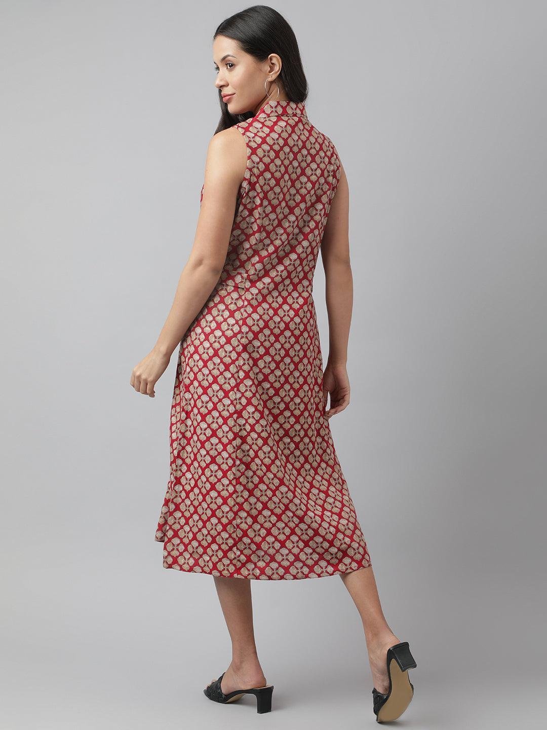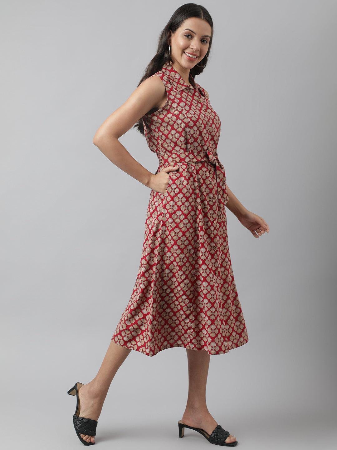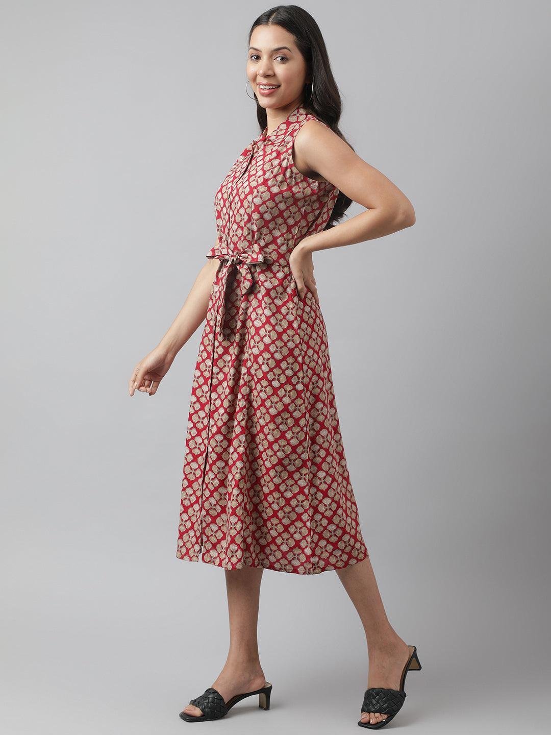 Rayon Maroon A-Line Floral Printed Midi Dress