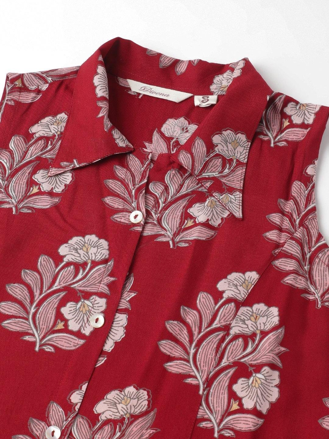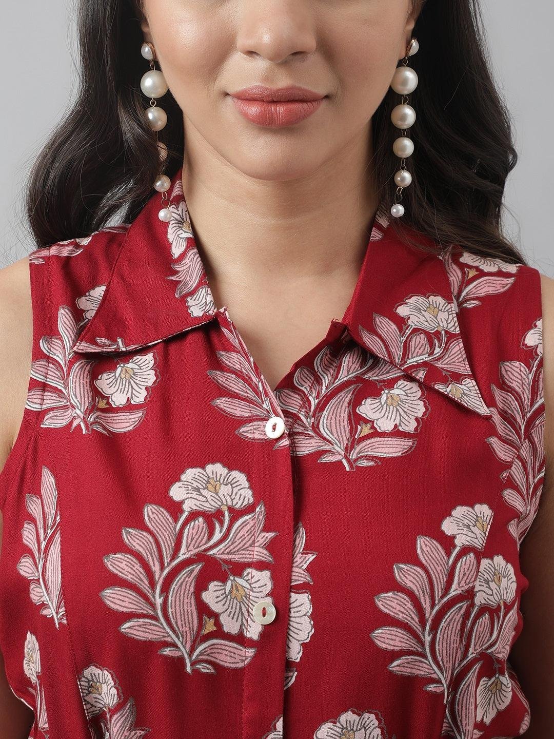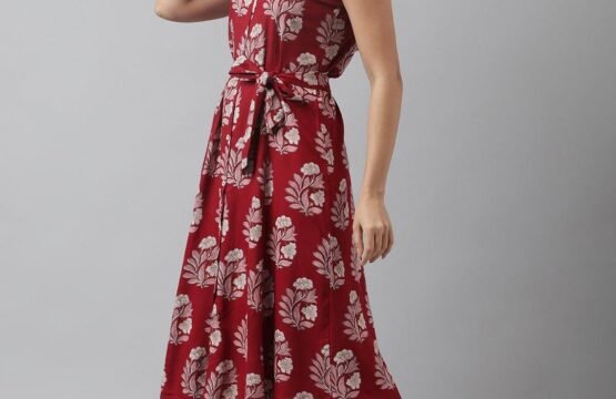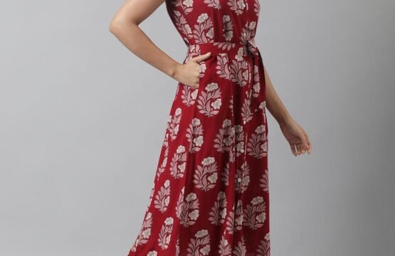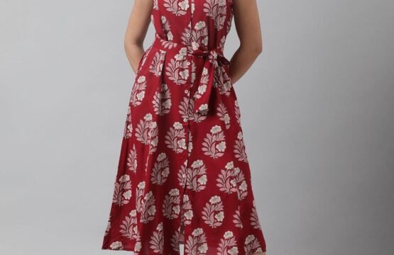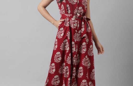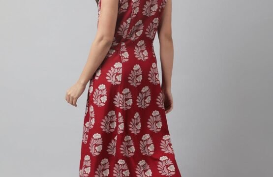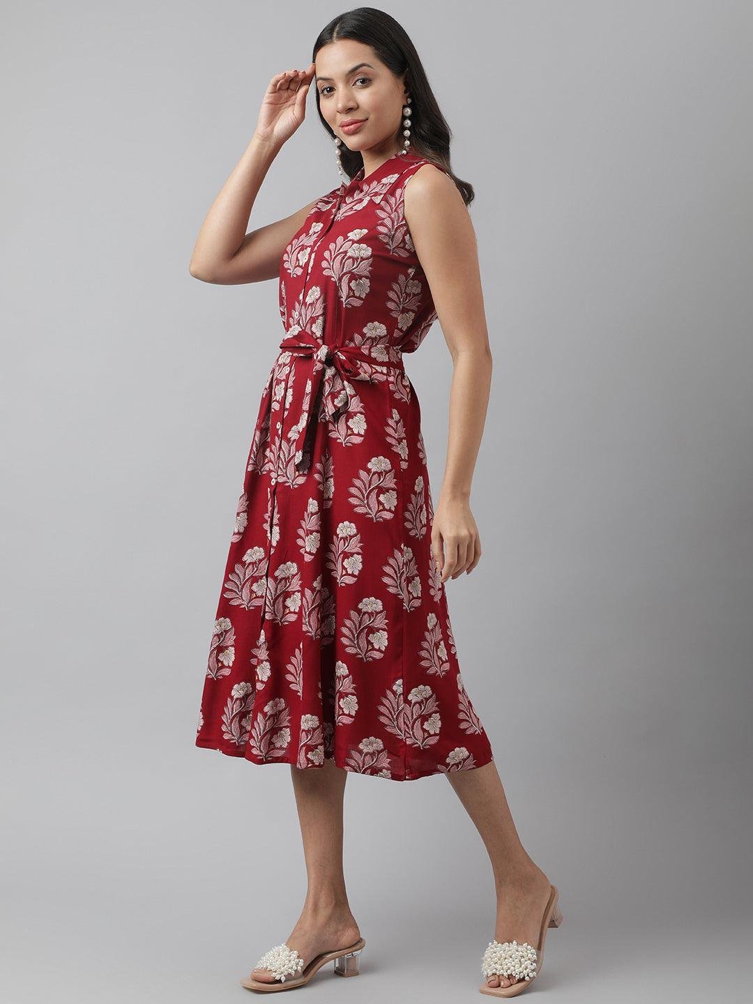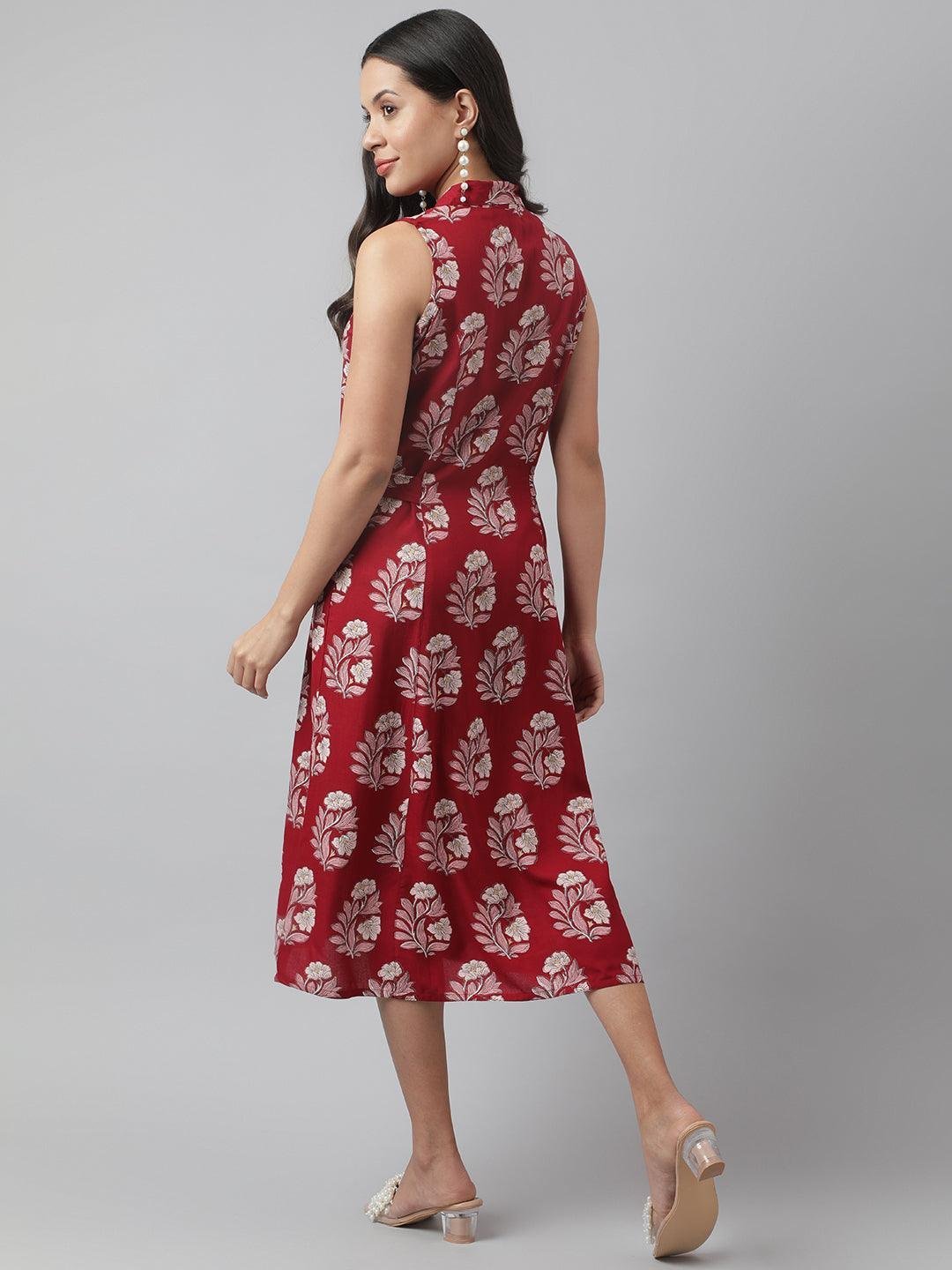 Rayon Maroon & Pink A-Line Floral Printed Midi Dress
