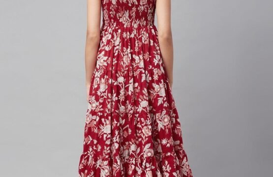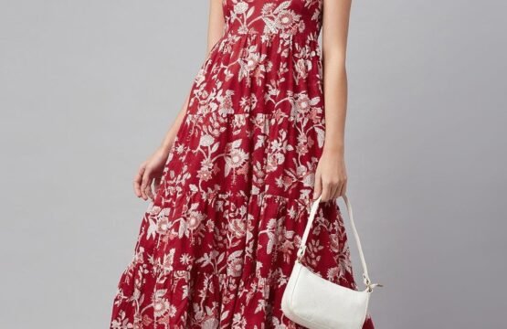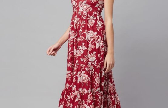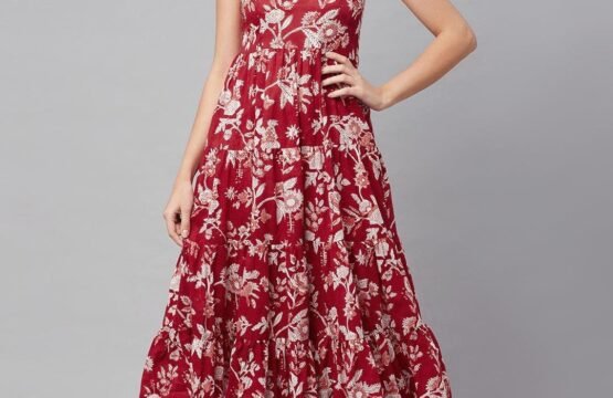 Wave Off The Summer Heat With Very Stylish, Red Floral Printed Shoulder Strap Long dress, Its Dressy, Whole Bottom Covered With Pompom Lace To Give Stylish Look , You Can Team It Up With Jacket Or Even Wear It On A Casual Evening Out, A Day Night , Or Partying With Friend. Team It Up With Minimal Accessory For Perfect Styling.